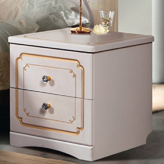 Ящики на шариковых направляющих, задняя стенка изготовлена из ХДФ. Крышка и фасад из МДФ плёночного. Тумба комплектуется металлической ручкой со вставкой из стекла напоминающей бриллиант или кристалл. Фасад декорирован золотой патиной с защитным водным покрытием/