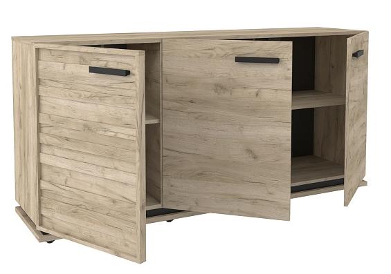 Тумба МЦН – функциональный модуль, который подходит не только для хранения вещей, но и для размещения телевизора. Тумба из трех отделений, за распашными дверцами которых полки, регулируемые по высоте. Изюминку тумбе придает необычный фасад в массивной раме и с раскладкой. Контрастные темные ручки из массива дерева подчеркивают цвет и текстуру натурального дерева. Регулируемые опоры компенсируют незначительные неровности пола.