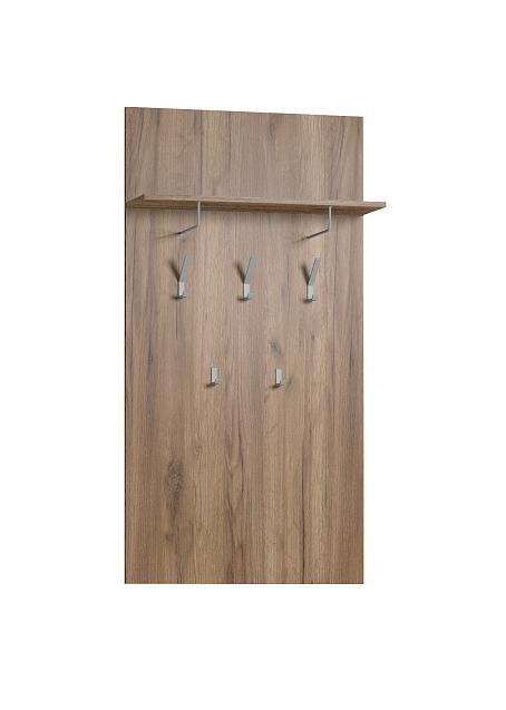 Настенная вешалка в прихожей имеет первостепенное значение. Верхняя полка для головных уборов глубиной 216 мм крепится с помощью Г-образного полкодержателя. Металлические крючки, цвета состаренное серебро, расположены на разной высоте. Всем членам семьи будет удобно вешать и снимать верхнюю одежду – каждому по росту.