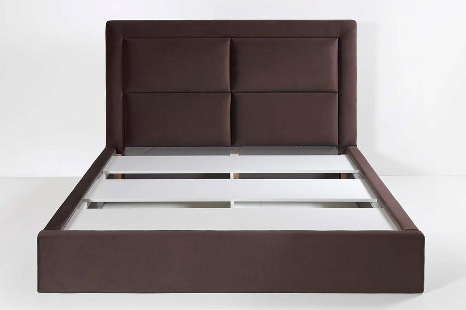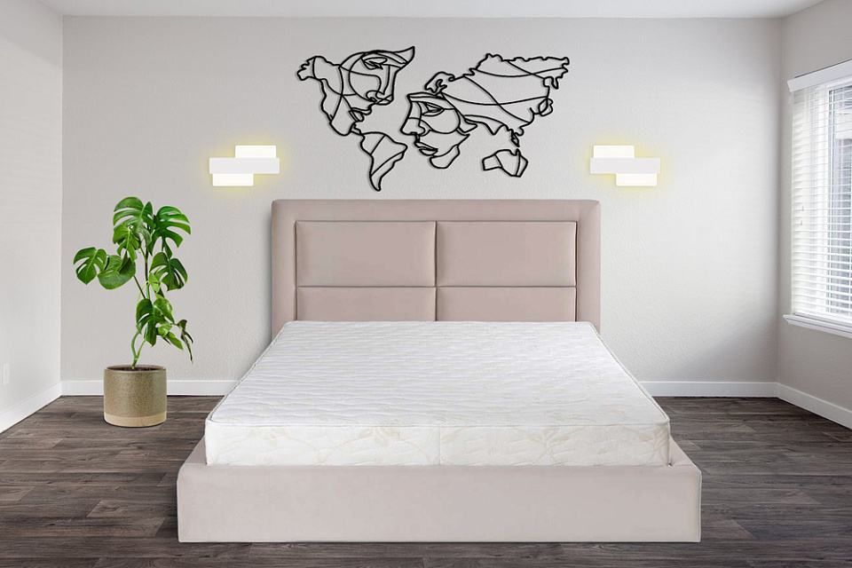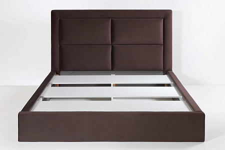 Высокое изголовье кровати выполнено в технике «каретная стяжка». Благодаря высокой посадке матраса, вставать с кровати будет очень удобно и легко.
