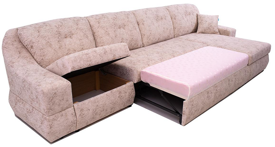 Самый популярный механизм из-за всеобщей моды на угловые диваны. Хорошо зарекомендовал себя по соотношению «цена — качество». Часть спального места находится под сиденьем , выдвигаем — получаем огромную кровать.