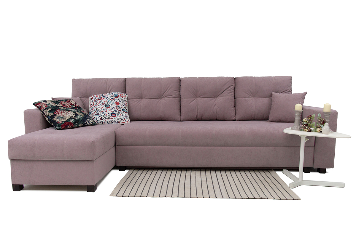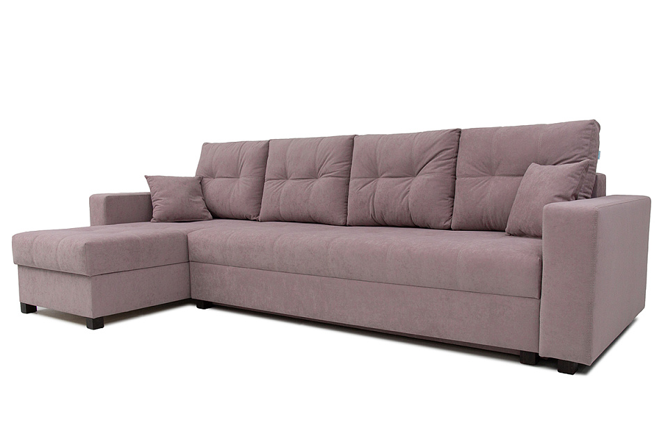 Комплект углового дивана включает в себя длинную секцию 1 Д и угловой модуль с подъемным механизмом 2П с ящиком для хранения постельного белья. Также в комплект входят 2 декоративные подушки. Угловая секция взаимозаменяемая — есть возможность монтажа как справа, так и слева от всей конструкции.