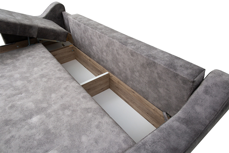 Комплект углового дивана включает в себя длинную секцию 1 Д и угловой модуль с подъемным механизмом 2П с ящиком для хранения постельного белья. Также в комплект входят 2 декоративные подушки. Угловая секция взаимозаменяемая — есть возможность монтажа как справа, так и слева от всей конструкции.