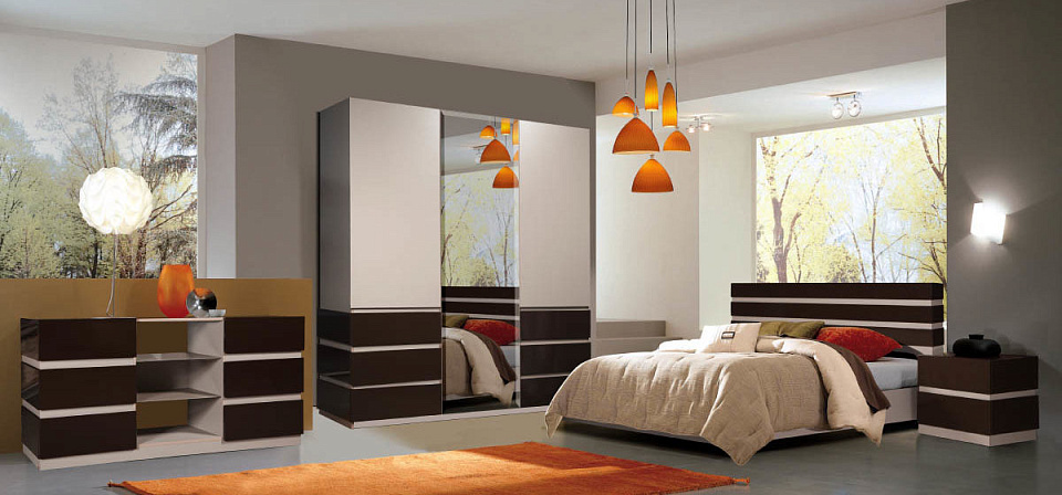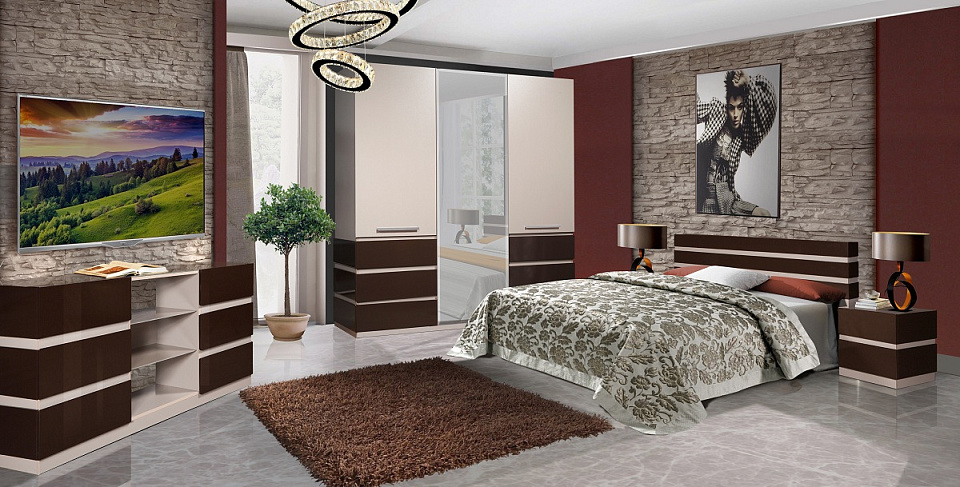 • «Изюминкой» спальни является стекло лакобель цвета "капучино", которое устанавливается в тумбах, комодах, кроватях на верхнюю часть изделия, а в шкафу-купе выполняет функцию фасада;
