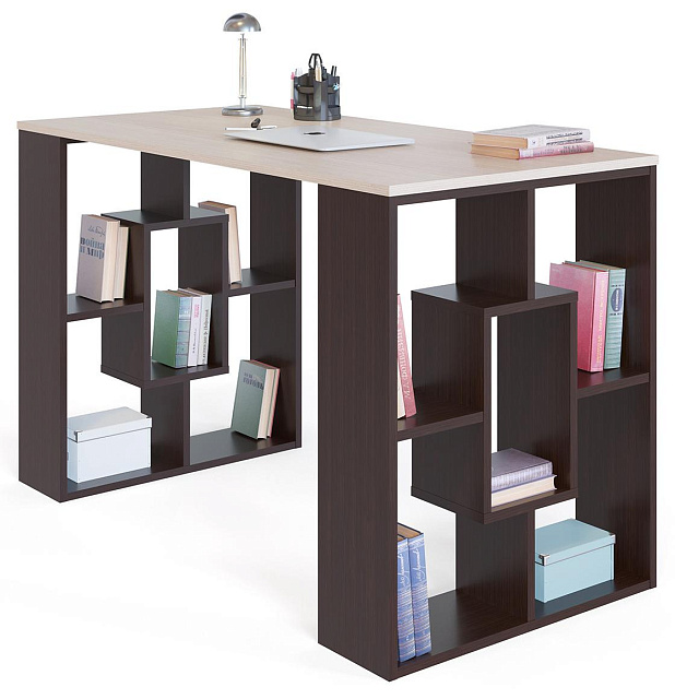 Стильный прямой письменный стол понравится всем любителям минималистичных светлых деталей в интерьере. Создавая эту модель, дизайнеры отошли от привычного оформления письменно стола и сделали его ножки функциональными — в виде стеллажей. Больше не нужно подбирать громоздкие тумбы, на столе достаточно места для ноутбука и нужных в работе материалов, а на его опорах — для книг, канцелярии и любимых предметов для настроения.