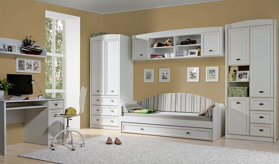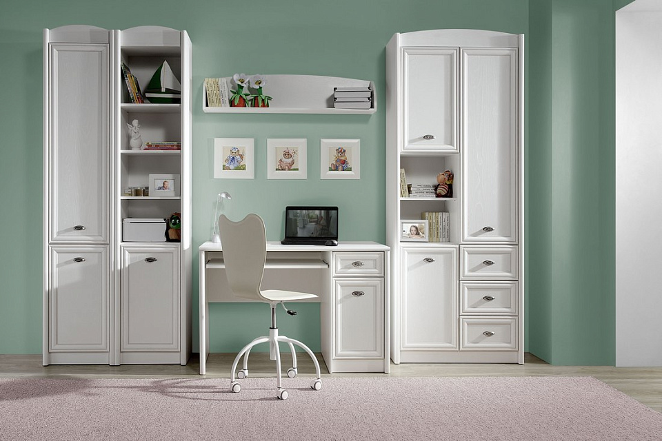 Нежный и мягкий белый цвет, оригинальные металлические ручки в виде "ракушки", закругленные верхние карнизы и патинированные фасады отражают неповторимый стиль коллекции. Созданная на основе последних тенденций в итальянском дизайне, коллекция подойдет для создания интерьера молодежной комнаты и элегантного рабочего кабинета. Набор мебели Salerno - это особенное настроение в вашем доме.