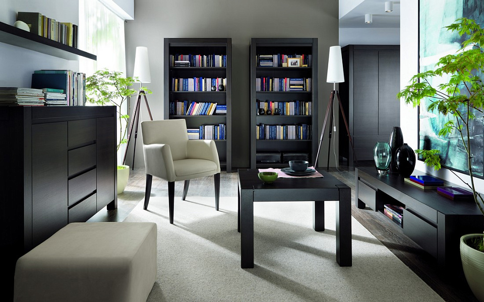 Коллекция носит массивный, монолитный характер, но при этом сохраняется легкость конструкций. Цвет дуб венге, в котором выполнена система, подчеркивает неповторимость и элегантность мебели.