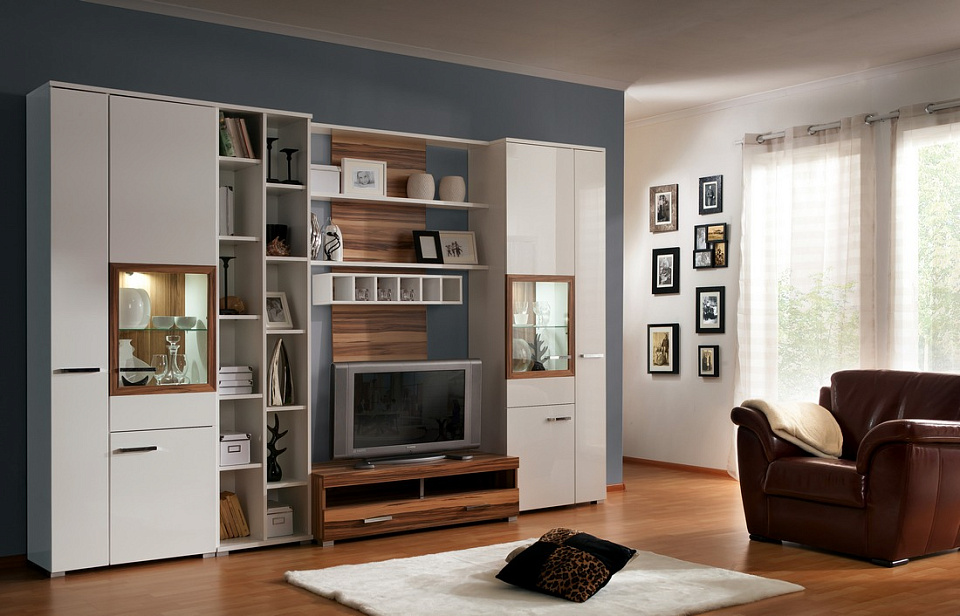 Особенностью данного набора мебели является интересное сочетание текстур и материалов. Роскошная комбинация древесной текстуры (орех балтимор) и блеска (белый блеск) создает ощущение оригинальности и свежести. Оригинальным является конструкторское решение некоторых элементов набора (полка S144-PAN/14/12, тумба S144-RTV2S/4/23). Стеклянные витрины обрамленные планкой цвета «орех балтимор» в сочетание с подсветкой придают набору изысканность и неповторимость. Функциональный дизайн и широкий модульный ряд предоставит Вам множество вариантов оформления гостиной. Стильный дизайн, четкость и лаконичность линий, гармоничное сочетание светлых и темных текстур – основные характеристики присущие набору модульной мебели Доломит.