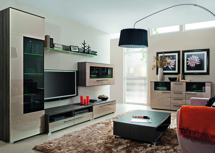 С помощью данного набора Вы с легкостью сможете создать свободный и светлый интерьер. Нельзя не обратить внимание на цветовое решение данного набора. Спокойные, мягкие, пастельные тона ясень коимбра темный и песочный блеск привносят в интерьер гостиной частичку тепла и света.<br>