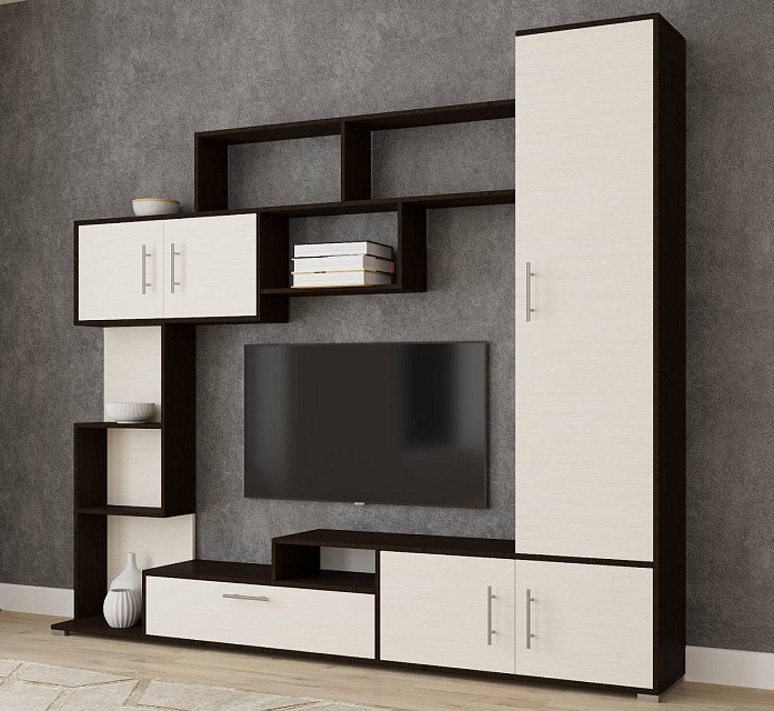 Компактная стенка с асимметричным расположением шкафов. Прекрасно подойдет для рабочих кабинетов, зала или гостиной .