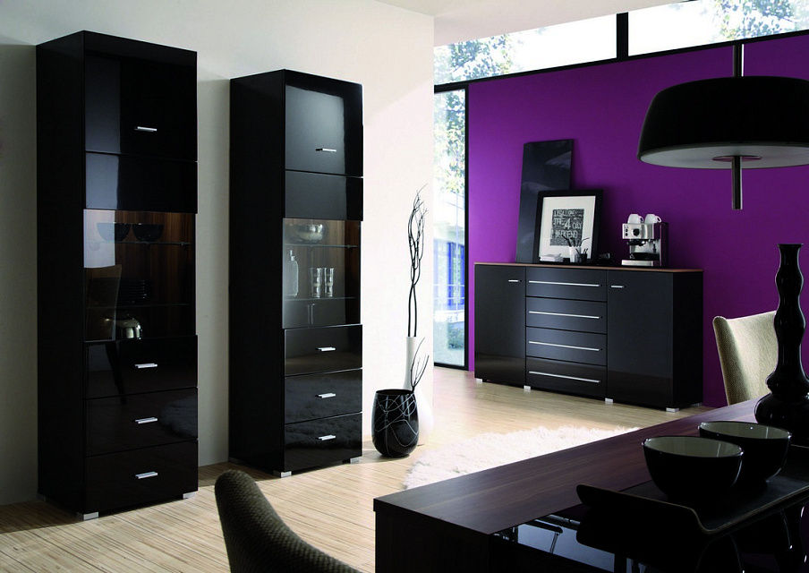 Современный характер коллекции предает фурнитура простой формы в цвете «алюминий». Удлиненные продольные ручки в комодах подчеркивают геометрические формы мебели, а подсветка стеклянных полок помогает создать неповторимый уют в интерьере.