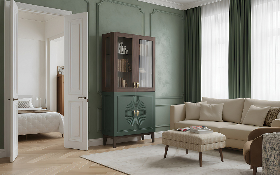 Сочетание насыщенного корпуса Гикори Прадо и акцентного фасада Комбу Грин формирует образ, в котором выразительность встречается с утончённостью. Тёплая древесная текстура наполняет интерьер уютом, а глубокий зелёный фасад придаёт пространству характер и индивидуальность.
