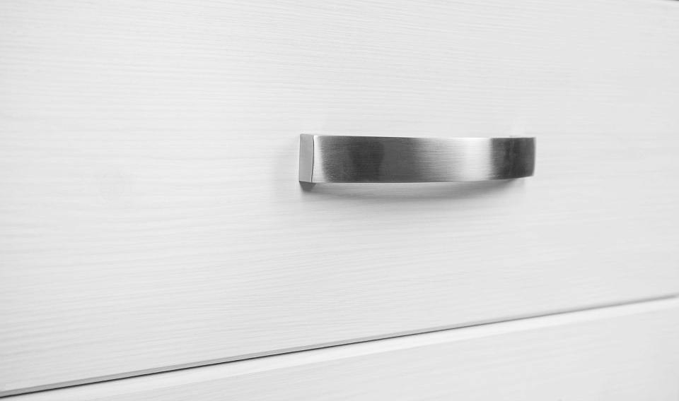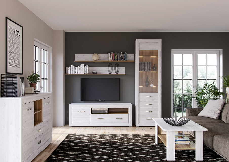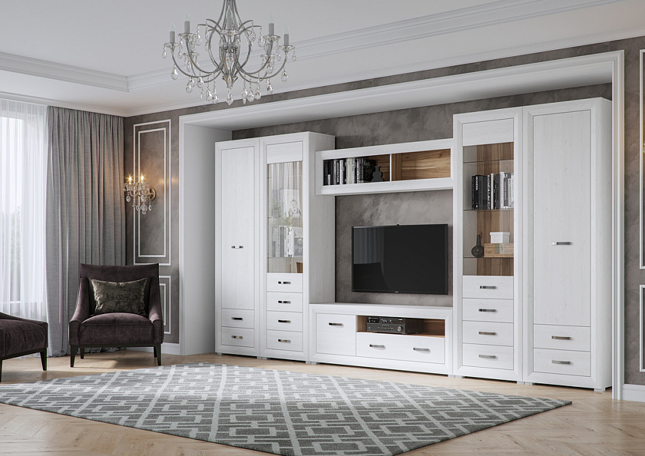 Великолепные белоснежные фасады коллекции удачно контрастируют со вставками из «ореха лион», продолговатые металлические ручки добавляют изящества, а подсветка стеклянных полок выгодно подчеркивает древесную структуру.