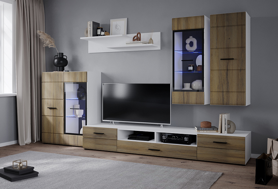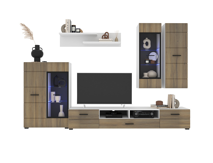 В комплект входят 5 модулей: тумба ТВ, напольный шкаф комбинированный со стеклом (укомплектован подсветкой), полка, навесной шкаф со стеклом (укомплектован подсветкой) , навесной шкаф.