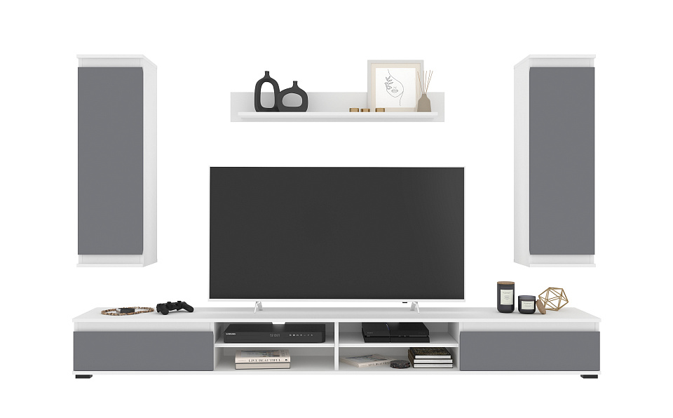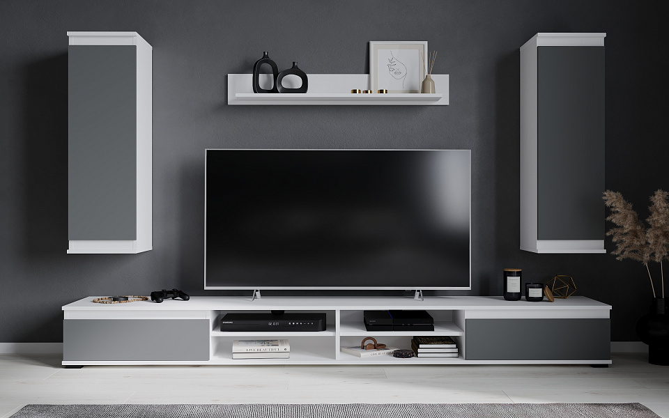 В набор входит 4 модуля: тумба ТВ, полка, 2 навесных шкафа.