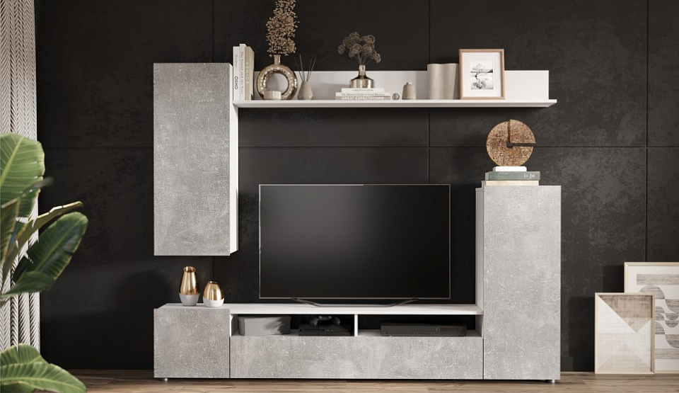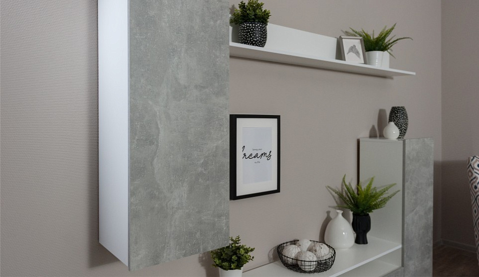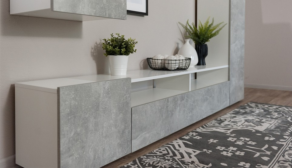 Мини-стенка «Нео» — современное, функциональное решение для гостиной, поможет рационально обустроить комфортную зону для отдыха и просмотра TV. Большая ниша для телевизора, закрытые шкафчики и открытые полки вместят в себя всё самое необходимое. Корпус выполнен в цвете белый жемчуг, который подчеркивает простые и легкие геометрические формы стенки. Фасады в новом модном цвете ателье светлый матовые-практичны и создают уют.