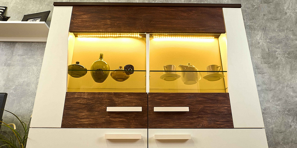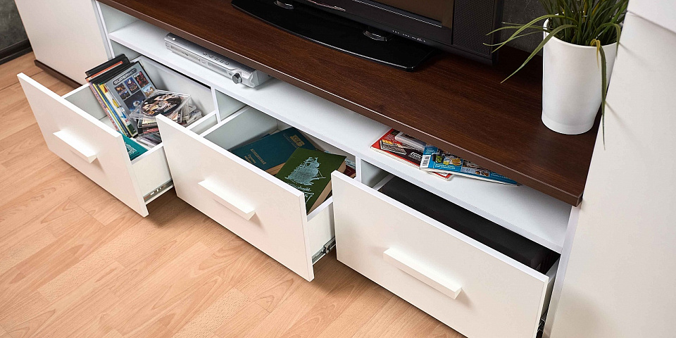 Основной декор гостиной НОРВУД — белый. Именно он отвечает за визуальное расширение пространства и освещения. Контрастные горизонтальные поверхности толщиной 22 мм в декоре Орех Шоколадный разбавляют белые фасады модулей.