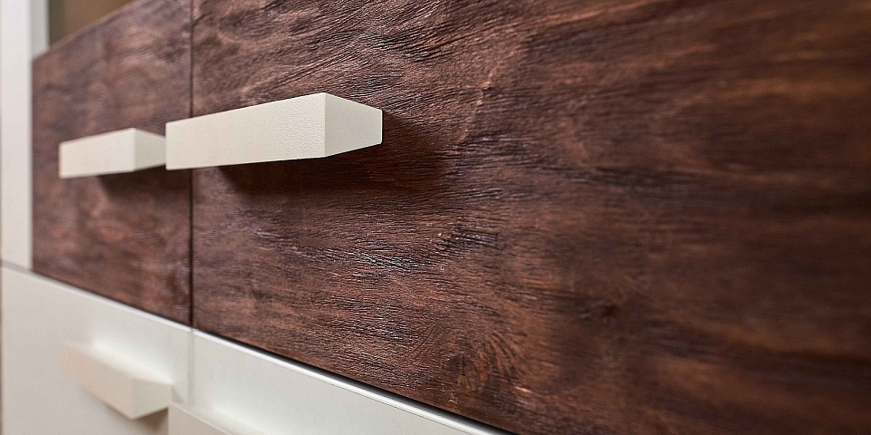 Белый на фасадах также отлично контрастирует с оригинальными брашированными вставками из дерева. Все вставки покрыты лаком, который подчеркивает рельеф структурной поверхности, делая рисунок деревянной вставки более объемным и выразительным.
