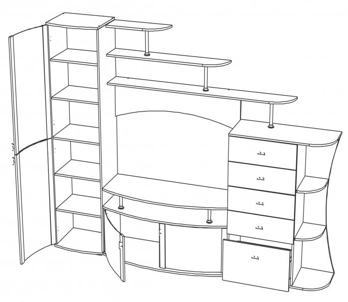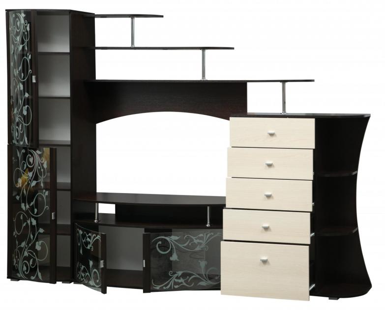 Стенка «Олимп-М15» отлично подходит для гостиных небольшого размера. Слева расположен узкий шкаф с полками и стеклянной дверцей, справа – отдел с пятью выдвижными ящиками и двумя полками, а посередине – ниша для ТВ-аппаратуры, полки со стойками, ниша для аудиотехники и вместительный отдел с распашными стеклянными дверцами. Все элементы из стекла украшаются затейливым пескоструйным рисунком. Для предохранения напольного покрытия от повреждений тумба устанавливается на пластиковые опоры.