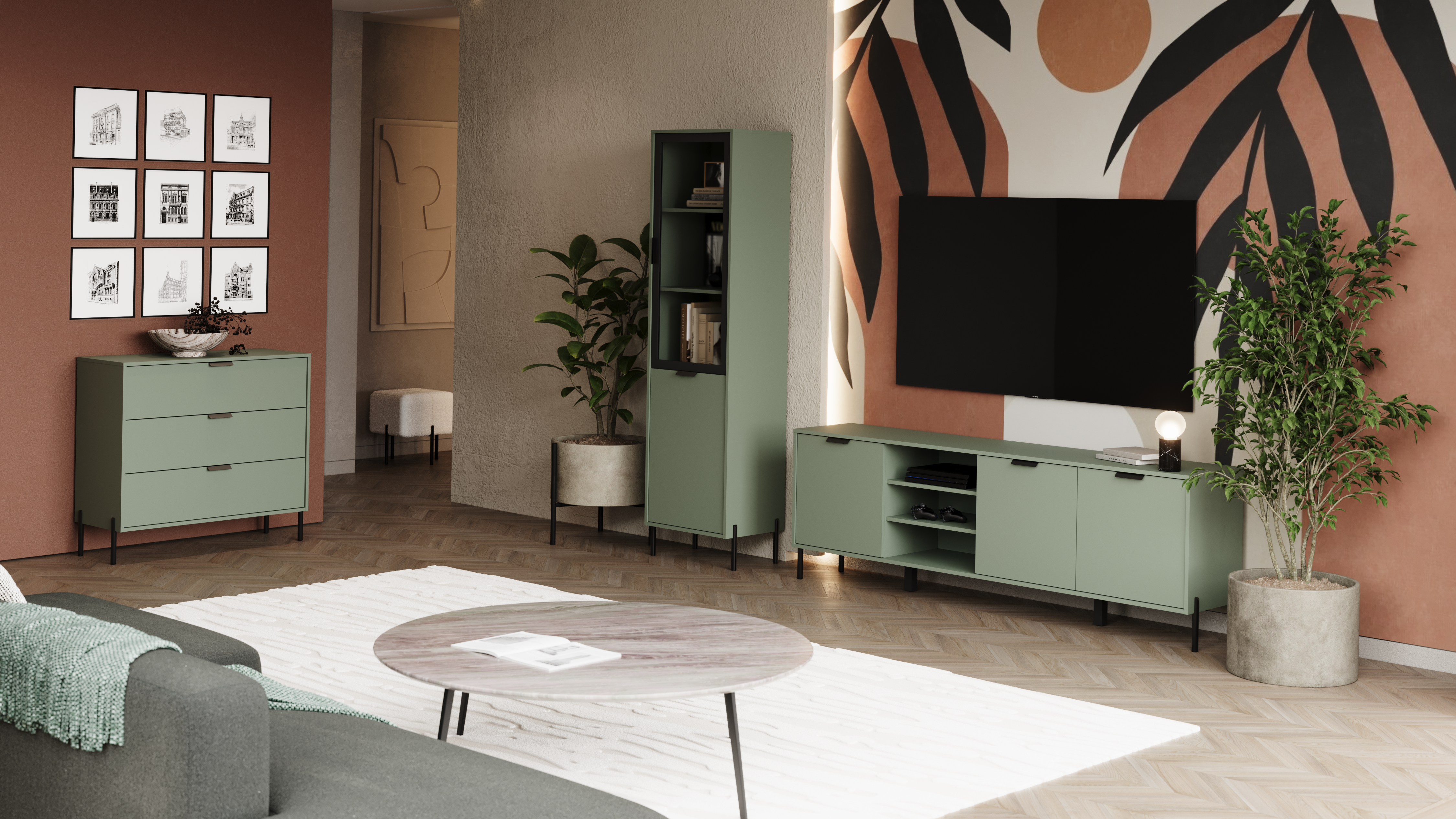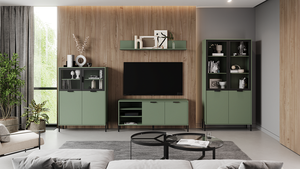 Вдохновленная северными просторами, коллекция мебели для гостиной в скандинавском стиле приносит в ваш дом свежесть утреннего тумана и мягкость солнечного света. Фасады и корпус, окрашенные в изысканный дымчатый зеленый цвет, отражают спокойствие природы, а декоративная черная планка создает выразительный контраст, привлекая взгляд.
