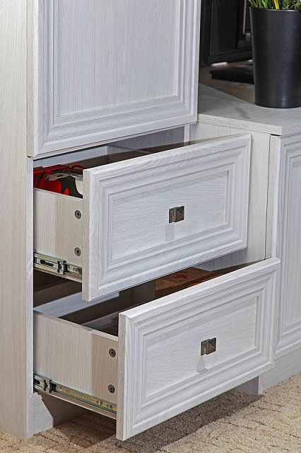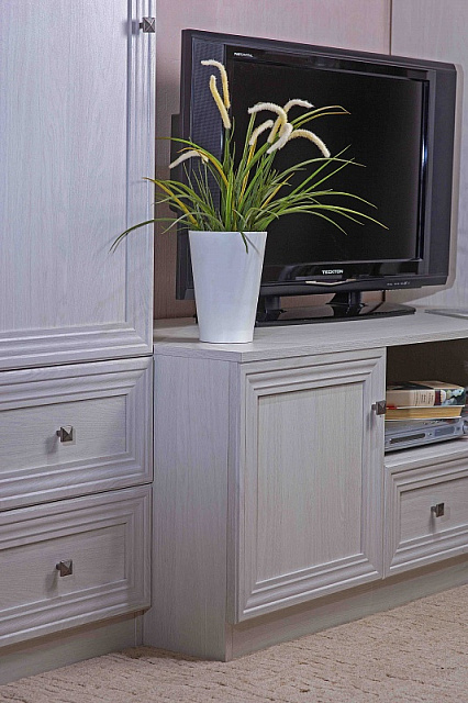 Рельефный профиль МДФ на фасадах и металлические мебельные ручки с эффектом полированного состаренного серебра – украшение коллекции. Металлические ручки не сотрутся со временем, а сложный профиль добавит гостиной роскоши и элегантности.