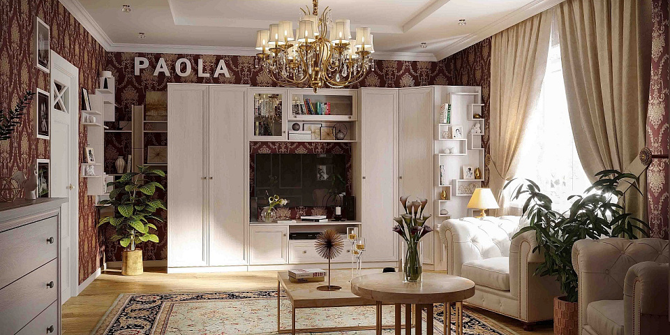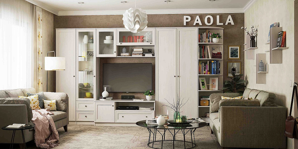 Стеклянные фасады коллекции PAOLA, обрамленные сложным профилем МДФ, и светлая цветовая гамма хорошо сочетается с любой современной мебелью и легко впишется в обстановку.