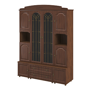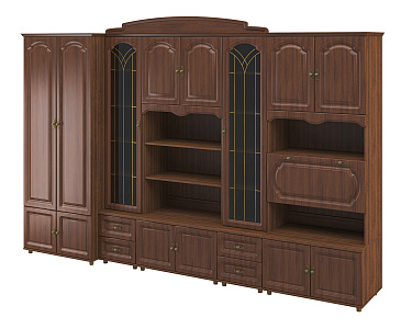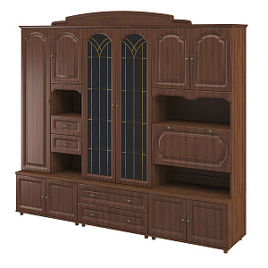 Мебель выглядит как единая архитектурная композиция, включающая шкафы, витрины, комоды, полки и стеллажи. Тёплый оттенок древесины, изящные золотые акценты и стеклянные элементы придают интерьеру глубину и свет, а классические формы подчёркивают статус и вкус владельца.