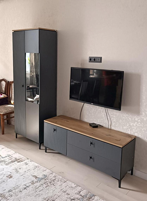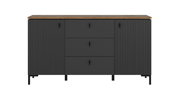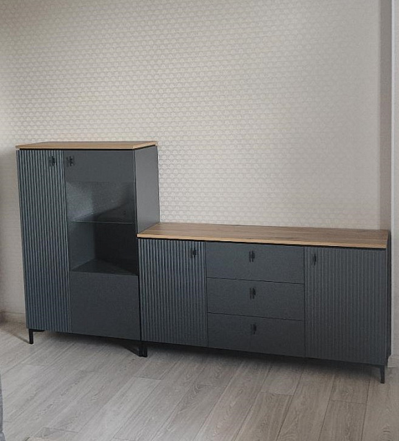 Темные гладкие и рифленые фасады, стильные высокие ножки, черные матовые ручки, акцентная столешница - отличительные особенности набора.