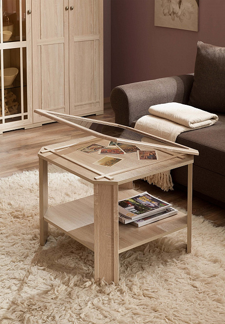 Оригинальный журнальный столик с откидной столешницей можно легко преобразить, дав волю своей фантазии.