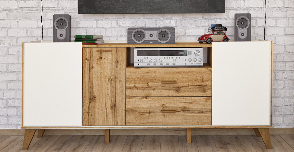 Коллекция "Сканди" изготовлена из комбинации высококачественных ламинированных плит белого цвета и цвета дуба вотан с деревянными ножками и ручками. Стандарт включает в себя высококачественные шариковые направляющие полного выдвижения и систему бесшумного закрытия дверей (петли с демпфером).