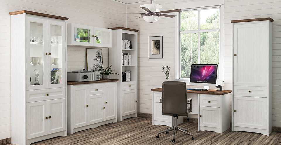 Отличительной чертой стиля «лёгкого кантри» является применение в дизайне не более трёх основных цветов. В качестве основного выступает белый со структурой под дерево, а в противовес ему для создания контраста идёт тёмный цвет с текстурой дуба. Такая универсальная цветовая гамма мебели легко впишется в большинство интерьеров и будет идеальным решением для владельцев любой квартиры или дома.