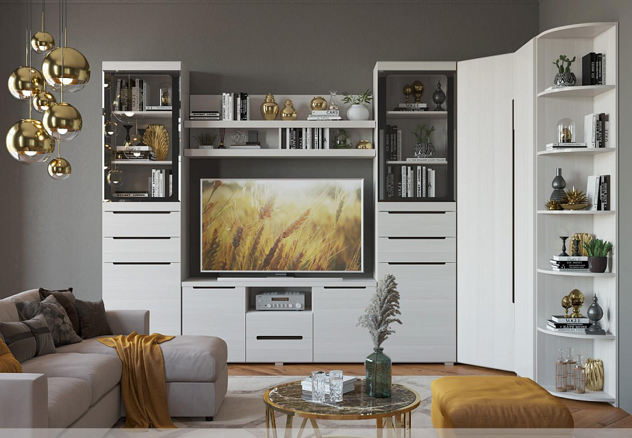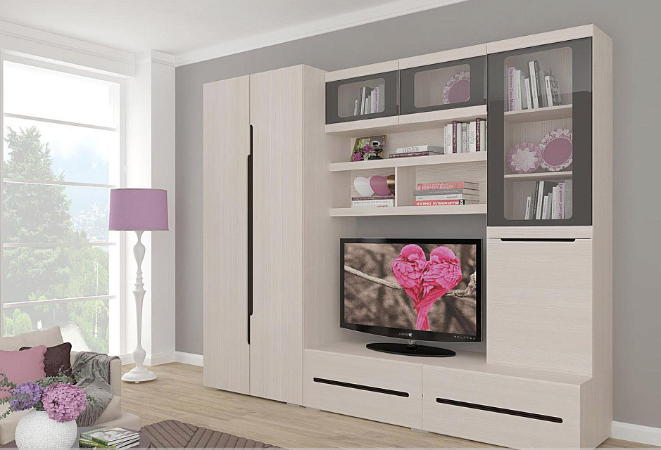 В шкафах, тумбах и антресолях используется фурнитура BAYARD: направляющие полного выдвижения, петли с доводчиком, регулируемые опоры L-20. Фасады МДФ под пленкой ПВХ, стекло декорировано фотопечатью черного и белого цвета с обработкой фацет. Особенностью серии является интегрированная ручка, которая придает гостиной индивидуальность и практичность.