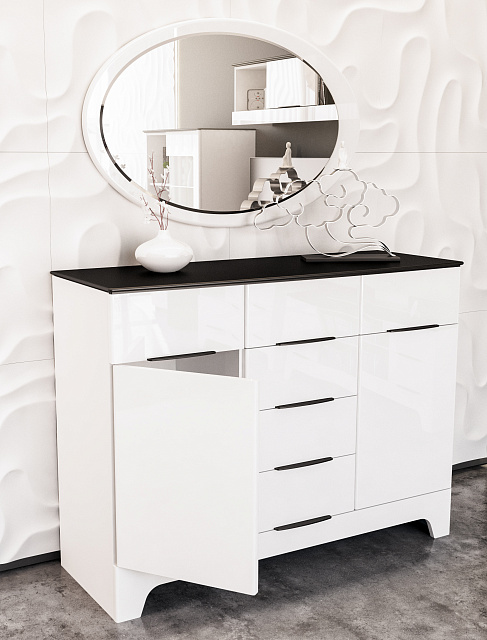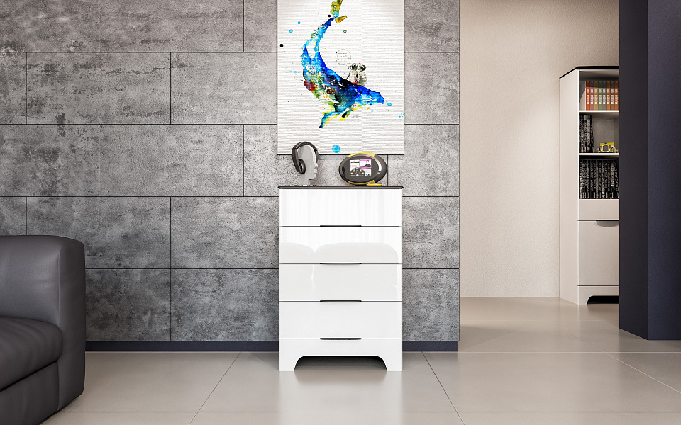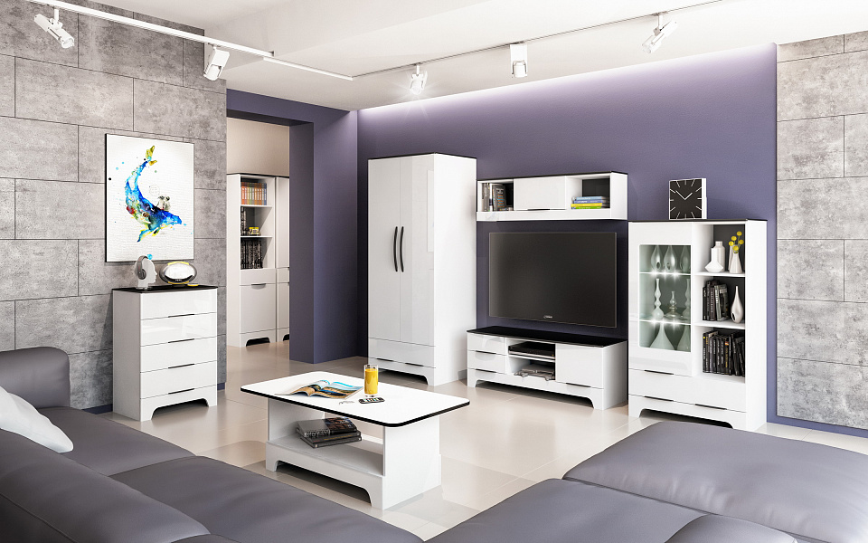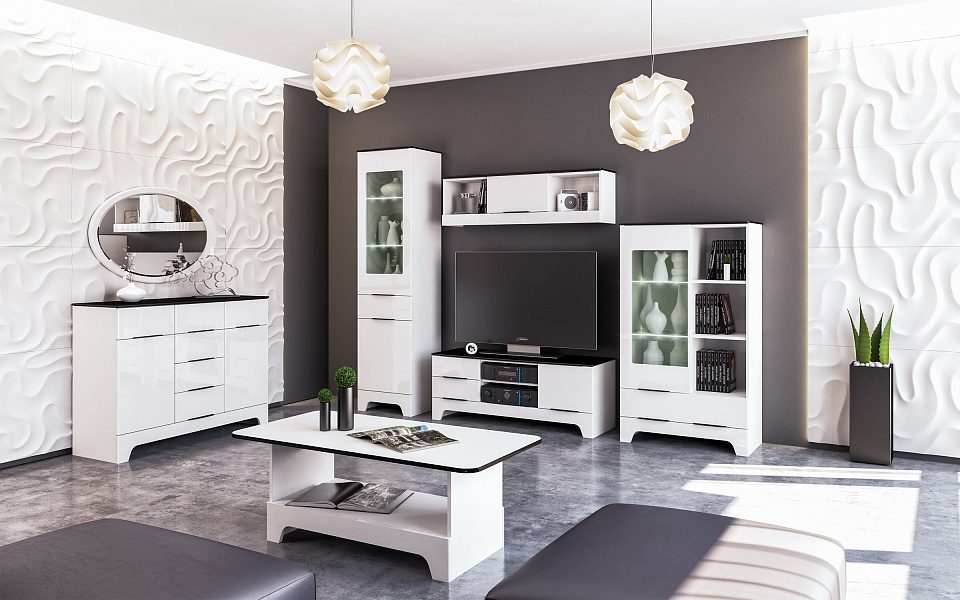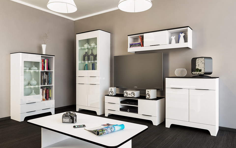 Эта коллекция прекрасно впишется в любой интерьер. За счет ультрамодного белого цвета гостиная приобретает необычайную легкость и чистоту. Черные элементы выгодно подчеркивают контуры, а глянец фасадов придает экстравагантности и лоска.