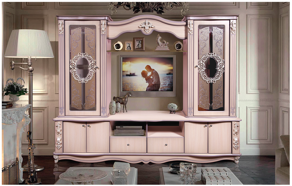 Набор мебели «Версаль» создан в классическом стиле и неподвластен влиянию быстроменяющейся моды. Эта мебель изящна, благородна, создает торжественную обстановку интерьера. Фасады мебели содержат: элементы массива в виде резьбы, рельефные планки опоры, карнизы, пилястры, величественная корона, изящные декоративные элементы, ажурный рисунок на стеклоизделиях, нанесенный методом шелкографии – вот основные черты мебели для этого изумительного стиля. Стеклоизделия закалены, что обеспечит долговечность и безопасность. Все видимые поверхности изделия из МДФ по фрезерованному профилю оттенены красителем патина и покрыты несколькими слоями лака для придания изделиям естественности, прочности и эффекта «массив древесины». Изделия выпускаются в двух цветовых гаммах: натуральный орех с патиной «шоколад» и нежный молочный с белой патиной. Модульность изделий из набора мебели позволяет скомплектовать мебель для гостиной с учетом размеров и вкуса покупателя. Данный набор мебели включает в себя шкаф комбинированный, комод и шкаф для одежды.