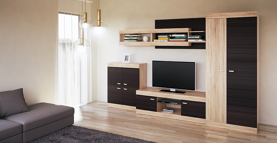 Фасад и корпус выполнены из ЛДСП. Дизайнерами отобраны два основных цвета - "дуб сонома" и "дуб ниагара". Цвета имеют древесную фактуру и пользуются высоким спросом среди покупателей на европейском и отечественном рынке.