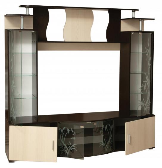 Многофункциональная стильная стенка «Виста-18», сочетающая изысканный дизайн и практичность. Её просторная центральная поверхность отлично подходит для установки плазменного телевизора или другой габаритной аппаратуры. По бокам от неё располагаются две секции со стеклянными полками, оснащённые распашными стеклянными дверцами. Последние украшаются очень привлекательным декором – пескоструйным растительным рисунком. Нижний блок тумбы разбит на три части: боковые закрываются глухими фасадами, а центральная – стеклянными створками с рисунком. Также модель имеет несколько верхних полок, на которые можно ставить книги или сувениры.