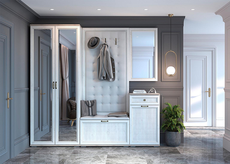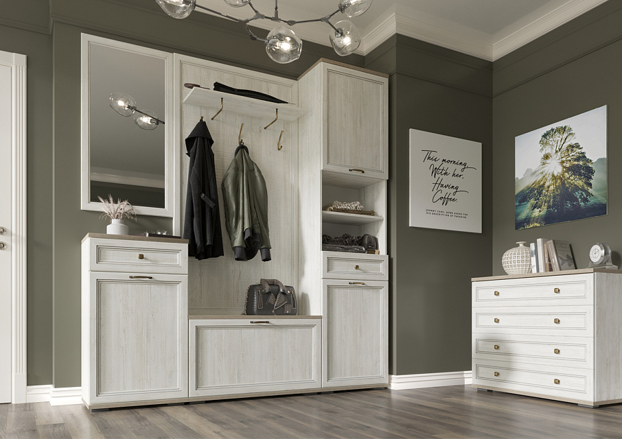 Модульная система для прихожей «Александрия» изготовлена из высококачественного ЛДСП в цвете сосна Санторини светлая. В качестве декоративного элемента выступают эксклюзивная рамка из МДФ с патиной и элегантные бронзовые ручки.