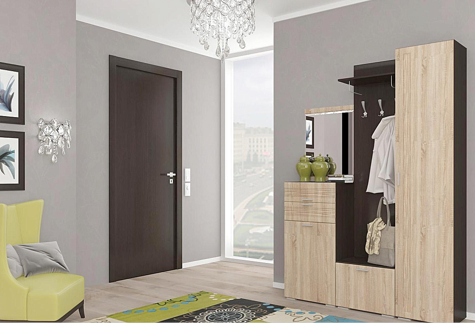 Современная прихожая с дизайном, который впишется в любой интерьер. Шкафы, несмотря на небольшую глубину, вместительны. В серии используется ручка 96 мм сатин светлый пластмасса. В шкафах появилась створка с разделенными зеркалами.
