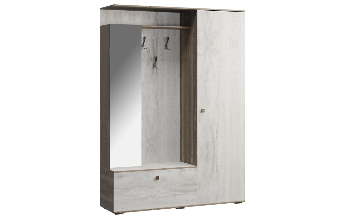 - Наполнение включает зеркало, три несъёмных полки в левой части и две справа, а также выдвижную штангу.