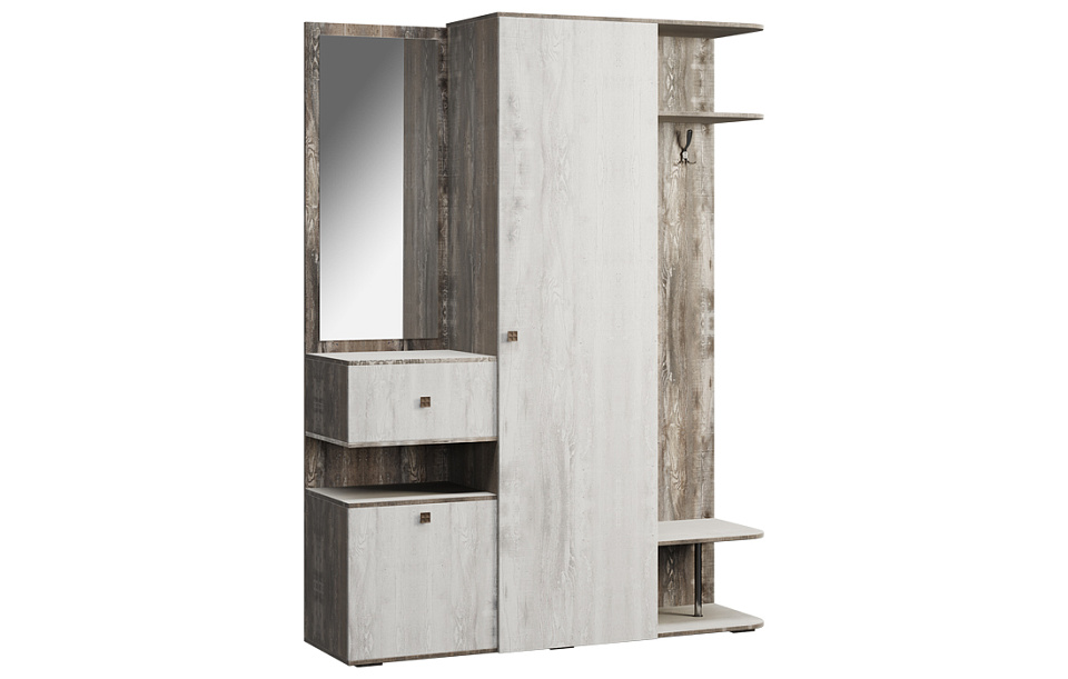 Наполнение шкафа включает слева два отделения. Средняя секция оборудована выдвижным ящиком, нижняя – полкой для обуви за откидной дверью. Зеркало также входит в комплект. Справа в нишу вмонтированы крючки, а в средней части размещены две стационарные полки и выдвижная штанга. Шкаф установлен на нерегулируемые опоры с тонкой прослойкой воздуха для облегчения общего вида.