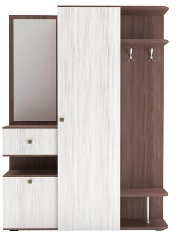 Наполнение шкафа включает слева два отделения. Средняя секция оборудована выдвижным ящиком, нижняя – полкой для обуви за откидной дверью. Зеркало также входит в комплект. Справа в нишу вмонтированы крючки, а в средней части размещены две стационарные полки и выдвижная штанга. Шкаф установлен на нерегулируемые опоры с тонкой прослойкой воздуха для облегчения общего вида.