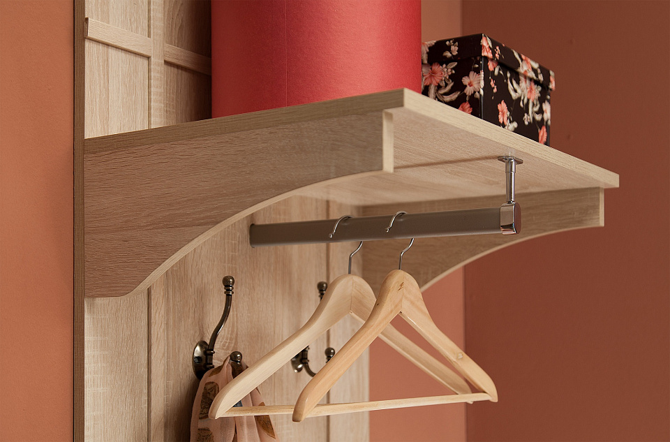 Узкая маленькая прихожая - вовсе не проблема. В простенок шириной всего 86 см может поместиться 7 плечиков с верхней одеждой, несколько курток на крючках, сумки, портфели, 18 пар обуви и средства по уходу за ней. Фантастика? Нет! Вам нужно всего два модуля: вешалка-стойка и узкий шкаф для обуви с выкатным стеллажом.