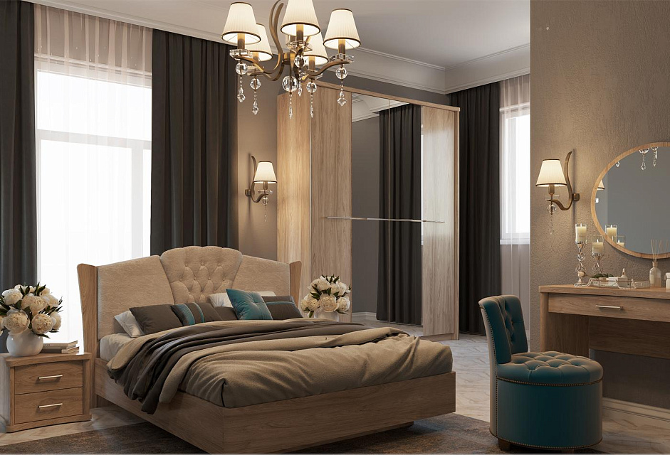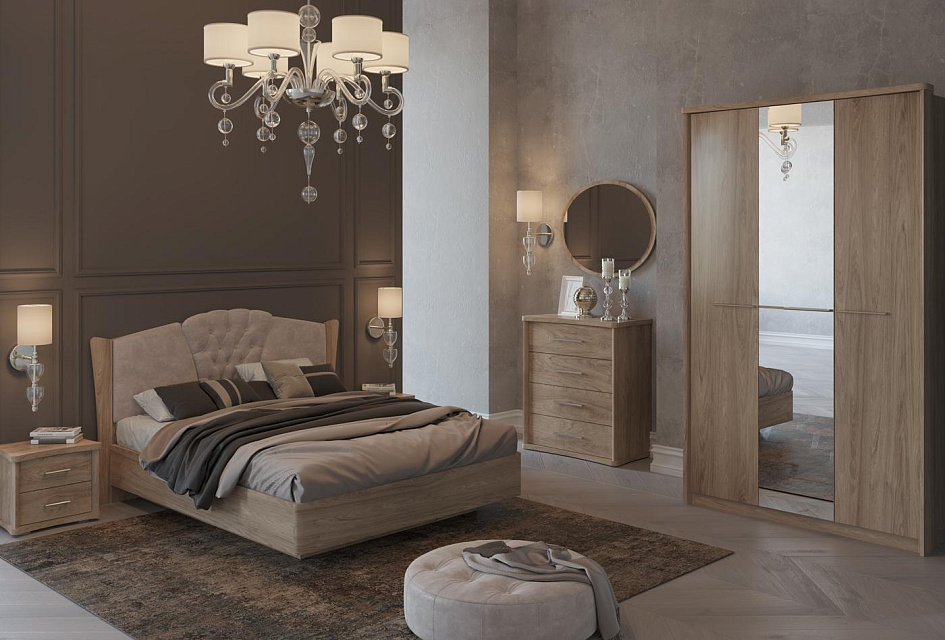 В серии представляем кровати на новой платформе с более жесткой конструкцией. Щит кровати состоит из трех подушек обтянутых микровелюром, центральная часть исполнена в стиле капитоне (каретная стяжка) и лаконичное завершение фрезерованные планки толщиной 32 мм. В кроватях используются бока ЛДСП толщиной 32 мм и 16 мм, которые облицованы кромкой ПВХ толщиной 2 мм. Внутренний корпус изготовлен из ЛДСП 16 мм. Размерный ряд кроватей - 1.4х2.0, 1.6х2.0, 1.8х2.0. Кровати изготовлены с подъемным механизмом КРП, внутри бельевой ящик, дно ящика изготовлено из ХДФ и безподъемного механизма КР. В серии представлены 3-х дверные шкафы шириной 1470 мм и 4-х дверные шкафы шириной 1928 мм, 3-х дверные шкафы можно собрать как на левую, так и на правую сторону, в зависимости от расположения полок. Высота шкафов составляет 2330 мм, а полезная глубина 568 мм. Шкафы изготовлены из материала ЛДСП 16 мм, задняя стенка из ХДФ. Фасады представлены в двух вариантах - створки из ЛДСП 16 мм, в комбинированном варианте створки из МДФ 16 мм под пленкой ПВХ Бетон бежевый или Антик медь.Центральные створки представлены взеркальном исполнении. В комодах, прикроватных тумбах и туалетном столике выдвижные ящики укомплектованы направляющими полного выдвижения. Дно ящика и задняя стенка выполнены из ХДФ и вставляются в паз. Крышки выполнены из ЛДСП 32 мм с изогнутыми линиями по 3-м сторонам и облицованы кромкой ПВХ толщиной 2 мм. Зеркало в овальной форме, для туалетного столика комплектуется отдельно.