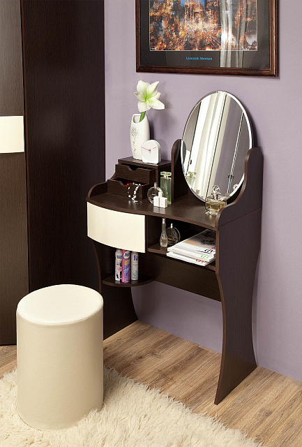 Специалисты не смогли остановиться и создали два варианта туалетных столов! Полюбившийся силуэт с овальным поворотным зеркалом, которое легко отрегулировать по высоте сидящей перед ним прекрасной дамы, решено повторить в расширенной версии: Туалетный стол 15 имеет дополнительный ящик и тумбу для косметики, шириной уже 1180 мм.