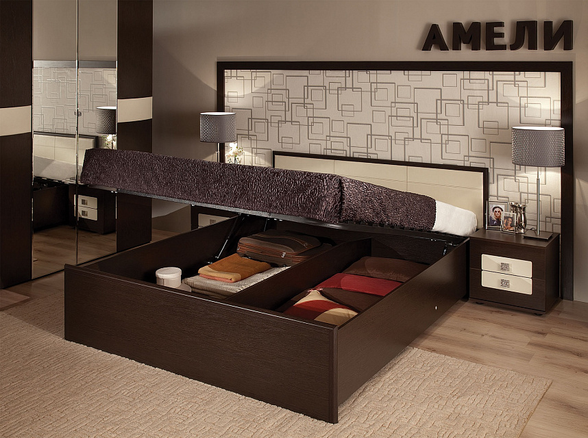 В коллекции Амели кровати комплектуются двумя видами оснований: с подъемным механизмом и обычным стационарным основанием из дерева или металла. По желанию также можно выбрать высоту изголовья на 812 или 1039 мм.