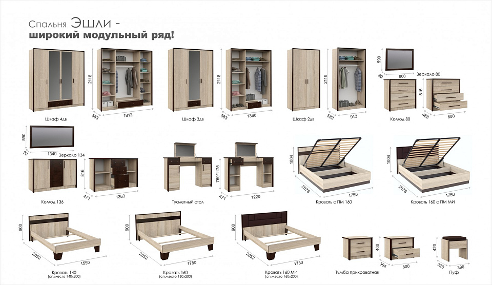 Система Эшли состоит из 15 модулей, которые позволяют выбрать все нужные элементы мебели в едином стиле.