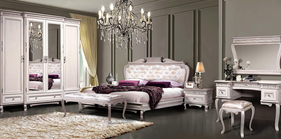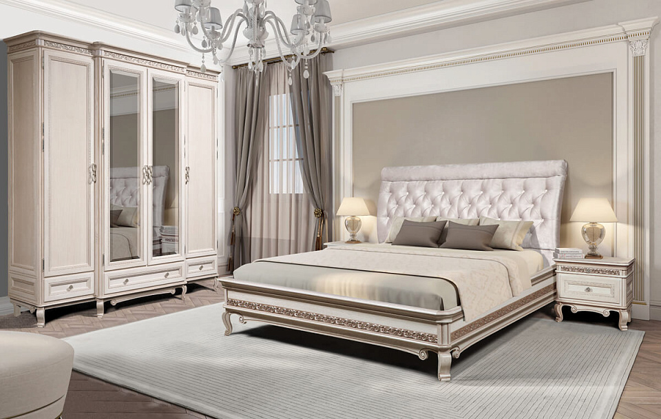 Элитная спальня из массива дуба. Ножки, накладки и багет из цельной древесины. Эксклюзивные ткани. Классический стиль исполнения. Множество резных элементов придают коллекции легкость и оригинальность.
