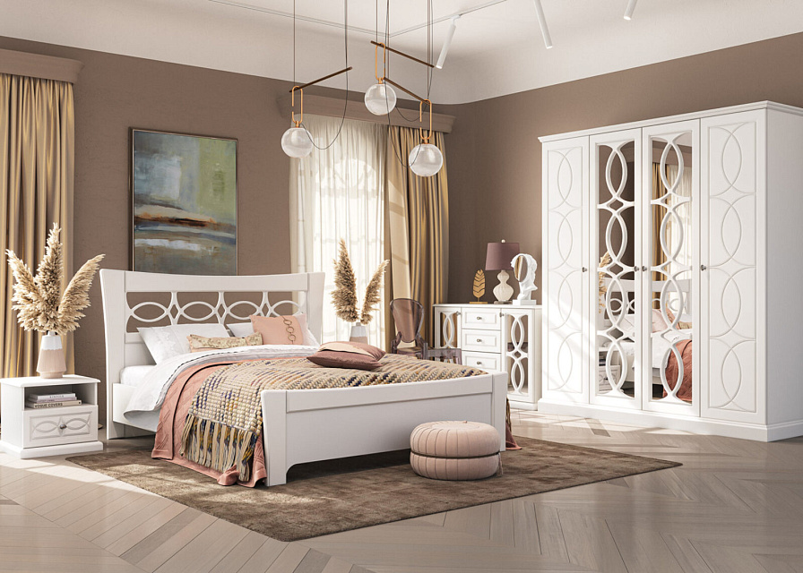 - «Изюминкой» спальни являются сквозная фрезеровка на МДФ, которая придаёт лёгкость и воздушность изделию.