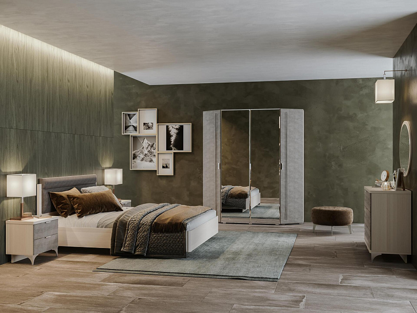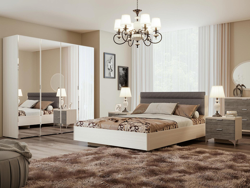 Материал корпуса - ЛДСП 16 мм. Задняя стенка выполнена из ХДФ, при этом в комодах, тумбах и ящиках она вставляется в паз. Выдвижные ящики снабжены шариковыми направляющими полного выдвижения. Тумбы и комоды комплектуются декоративными опорами 110 мм, а распашные шкафы - регулируемыми опорами L-20. Фрезерованные крышки комодов и тумб толщиной 32 мм облицованы кромкой ПВХ толщиной 1 мм. Изголовье кроватей - щит толщиной 32 мм с двумя подушками, обтянутыми экокожей либо микровелюром. Корпус кроватей представлен в двух вариантах: КР и КРП. КР - конструкция с анатомической решеткой; КРП укомплектована анатомической решеткой и вместительным бельевым ящиком с подъемным механизмом.