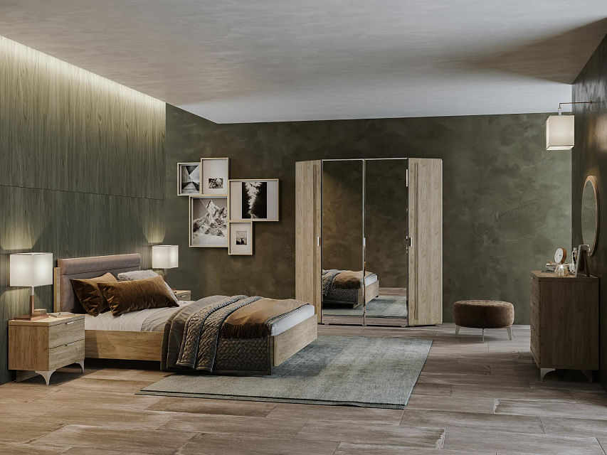 Материал корпуса - ЛДСП 16 мм. Задняя стенка выполнена из ХДФ, при этом в комодах, тумбах и ящиках она вставляется в паз. Выдвижные ящики снабжены шариковыми направляющими полного выдвижения. Тумбы и комоды комплектуются декоративными опорами 110 мм, а распашные шкафы - регулируемыми опорами L-20. Фрезерованные крышки комодов и тумб толщиной 32 мм облицованы кромкой ПВХ толщиной 1 мм. Изголовье кроватей - щит толщиной 32 мм с двумя подушками, обтянутыми экокожей либо микровелюром. Корпус кроватей представлен в двух вариантах: КР и КРП. КР - конструкция с анатомической решеткой; КРП укомплектована анатомической решеткой и вместительным бельевым ящиком с подъемным механизмом.